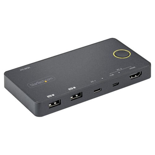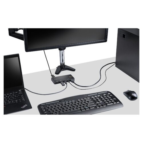 With this 2-port USB-C™/USB-A KVM, you can easily switch between two USB Type-C or Thunderbolt™ 3 desktop or laptop computers using just one keyboard, one HDMI monitor, and one mouse.