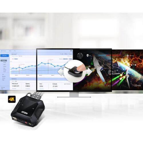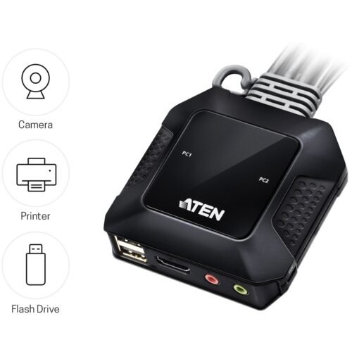 ATEN 2-Port USB 4K HDMI Cable KVM Switch with Remote Port Selector, 4096 x 2160 pixels, 4K Ultra HD, 3.47 W, Black
