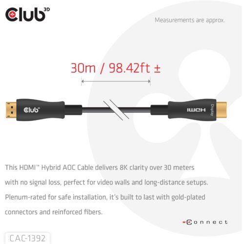 CLUB3D HDMI™ Hybrid AOC Cable 8K60Hz/4K120Hz 30m / 98.42 ft, 30 m, HDMI Type A (Standard), HDMI Type A (Standard)