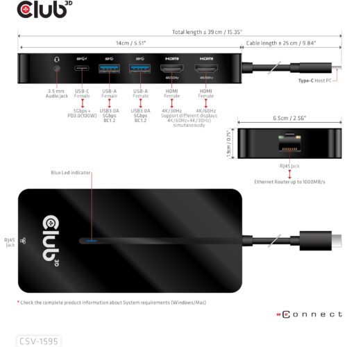 CLUB3D USB Gen1 Type-C 7-in-1 hub with 2x HDMI, 2x USB Gen1 Type-A, 1x RJ45, 1x 3.5mm Audio, 1x USB Gen1 Type-C 100W Female port, USB 3.2 Gen 1 (3.1 Gen 1) Type-C, 100 W, 10,100,1000 Mbit/s, Black, 4K Ultra HD, 60Hz