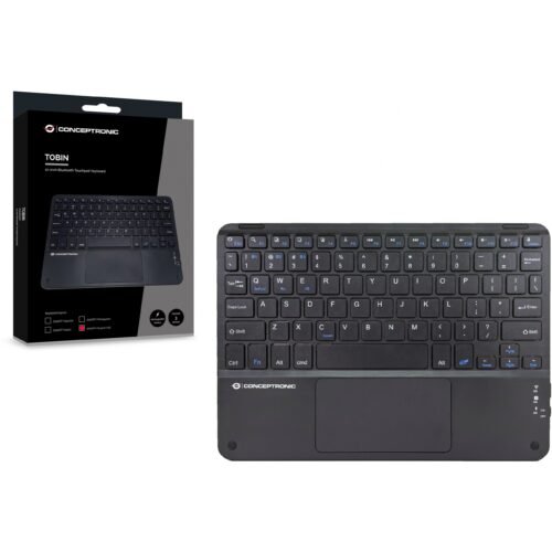 Conceptronic TOBIN01BUS 10-inch Bluetooth keyboard with touchpad, QWERTY EN (US). Keyboard form factor: Tenkeyless (80-87%). Keyboard style: Straight. Transmission technology: Wireless. Device interface: Bluetooth. Keyboard layout: QWERTY. Recommended use: Universal. Product color: Black.