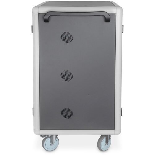 The mobile charging cabinet from DIGITUS® is the ideal and compact solution for storing and charging your portable devices, such as notebooks and tablets. Mobile charging cabinets are often used in public facilities such as schools to securely store devices in a central location and charge them simultaneously. The cabinet contains three rows of 10 charging stations, each with its own USB port on the front. Additionally, the devices can be connected to the rear via built-in power strips (3 x 10-way protective contact). Thanks to the generous cable routing and excess cable storage, optimal cable management is guaranteed. Built-in fans (3 x 24 V) in conjunction with ventilation slots ensure active cooling of the cabinet.
