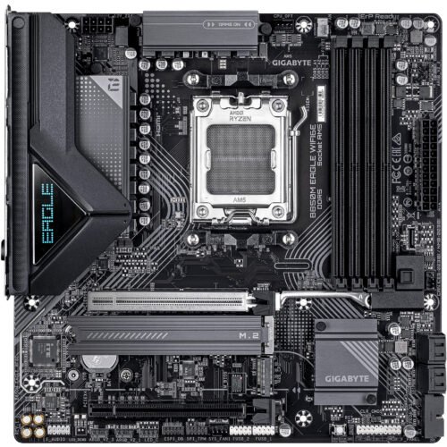 GIGABYTE B850M EAGLE WIFI6E Motherboard – AMD Ryzen 9000 Series CPUs, 8+2+2 Phase Digital VRM, up to 8200MHz DDR5 (OC), 1x PCIe 5.0 + 1x PCIe 4.0 M.2, Wi-Fi 6E, 2.5GbE LAN, USB 3.2 Gen 2. Processor manufacturer: AMD, Processor socket: Socket AM5, Compatible processors: AMD Ryzen 7000 Series, AMD Ryzen 8000 Series, AMD Ryzen 9000 Series. Supported memory: DDR5-SDRAM, Maximum RAM: 256 GB, Memory type: DIMM. Supported storage drive interfaces: M.2, PCI Express 4.0, PCI Express 5.0, SATA III; Supported storage drives: HDD & SSD; RAID levels: 0, 1, 5, 10; Maximum resolution: 4096 x 2160 pixels; Ethernet interface type: 2.5 Gigabit Ethernet; LAN controller: Realtek RTL8125; Top WLAN standard: Wi-Fi 6E (802.11ax)