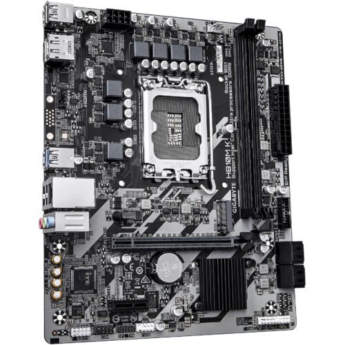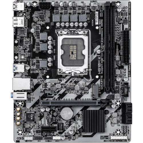 GIGABYTE H810M K Motherboard – Intel Core Ultra (Series 2) Processors, 3+1+2 Phase VRM, up to 6400 MHz DDR5, 1 x M.2 PCIe 4.0, 1 GbE LAN, USB 3.2 Gen 1. Processor Manufacturer: Intel, Processor Socket: LGA 1851 (Socket V1), Compatible Processors: Intel Core Ultra (Series 2). Supported Memory: DDR5 SDRAM, Maximum RAM: 128 GB, Memory Type: DIMM. Supported Storage Interfaces: M.2, PCI Express 4.0, SATA III, Supported Storage Drives: HDD & SSD, RAID Levels: 0, 1, 5, 10. Maximum Resolution: 4096 x 2160 pixels. Ethernet Interface Type: Gigabit Ethernet, LAN Controller: Realtek RTL8111H