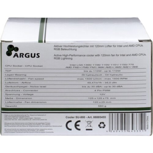 This CPU cooler, with its quiet 120mm RGB fan, provides reliable cooling for your CPU up to a TDP of 110W. The SU-800 is compatible with numerous Intel and AMD sockets. Thanks to pre-installed mounting clips for AMD and accessories for Intel, it fits most current platforms and can be installed quickly. The 120mm RGB fan with a 4-pin PWM connector can be temperature-controlled and adds a splash of color to your case, with a maximum noise level of 30.0dBA. Its relatively low profile of 65mm makes it ideal for use in smaller cases. The cooling fins ensure optimal heat dissipation and excellent cooling performance. Its transparent RGB fan, with optimized blade configuration, not only adds a touch of visual flair but also enhances performance.