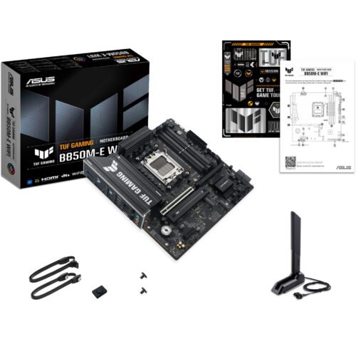 ASUS TUF GAMING B850M-E WIFI. Processor manufacturer: AMD, Processor socket: Socket AM5, Compatible processors: AMD Ryzen 7000 Series, AMD Ryzen 8000 Series, AMD Ryzen 9000 Series. Supported memory: DDR5-SDRAM, Maximum RAM: 256 GB, Memory type: DIMM. Supported storage drive interfaces: M.2, PCI Express 4.0, PCI Express 5.0, SATA III, Supported storage drives: HDD & SSD, RAID levels: 0, 1, 5, 10. Ethernet interface type: 2.5 Gigabit Ethernet, Top WLAN standard: Wi-Fi 6E (802.11ax), WLAN standards: Wi-Fi 6E (802.11ax). Component for: PC, Motherboard form factor: micro ATX, Motherboard chipset family: AMD