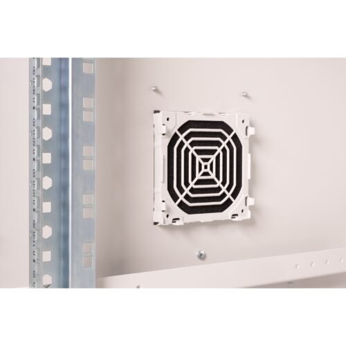 The wall-mounted industrial network cabinets are specially designed for harsh environments, especially outdoors, with an IP55 protection rating. The wall-mounted enclosures offer optimal performance thanks to features such as a 3-point locking system with a lockable swivel handle and insulated PG cable glands. Integrated ventilation filter housings ensure fresh air intake (protection against water and dust ingress according to IP54). Applications include outdoor areas exposed to environmental influences (rain, dust, hail, snow, splash water). The roof chassis is also equipped with a filtered area to accommodate a fan module. A pair of galvanized 483 mm (19″) profile rails, labeled with height units that can be read in both directions, are installed inside. These rails are depth-adjustable. Each cabinet is a robust steel construction made of sheet steel up to 2.0 mm thick. The color is electrostatically powder-coated in the standard color gray (RAL 7035). Wall mounting is achieved using the included mounting brackets. Optionally, the cabinets can be used with a base as a freestanding solution or attached to poles using a mounting kit.