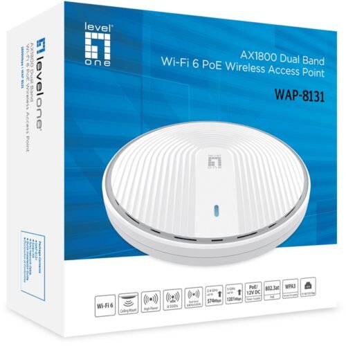 The LevelOne WAP-8131 is a stand-alone, AX1800 dual-band Wi-Fi 6 PoE wireless access point equipped with two Gigabit Ethernet ports and advanced 802.11ax Wave 2 MU-MIMO (Multi-User Multiple-Input Multiple-Output) technology, enabling multiple client devices to simultaneously deliver high-bandwidth Wi-Fi signals of up to 1775 Mbps and distribute data more efficiently. Operating in both 2.4 and 5 GHz frequencies, the WAP-8131 can be used as a high-quality stand-alone access point in enterprise environments or for demanding installations. It also supports the new WPA3 encryption. The WAP-8131 is also PoE-equipped, eliminating the need for an external power supply and simplifying installation. It's a fast, versatile, and secure access point for a wide range of network requirements, especially when high speeds for many users are critical.